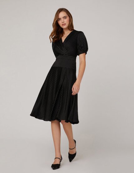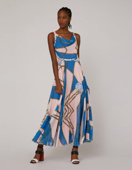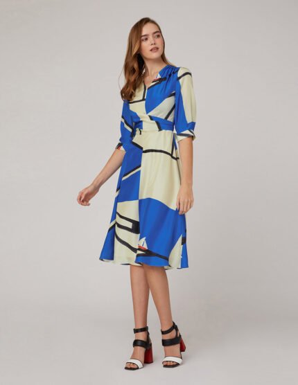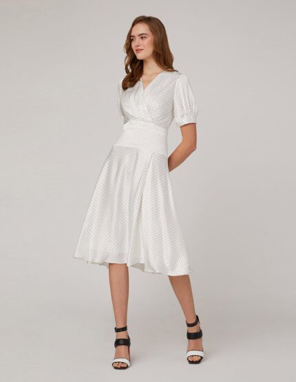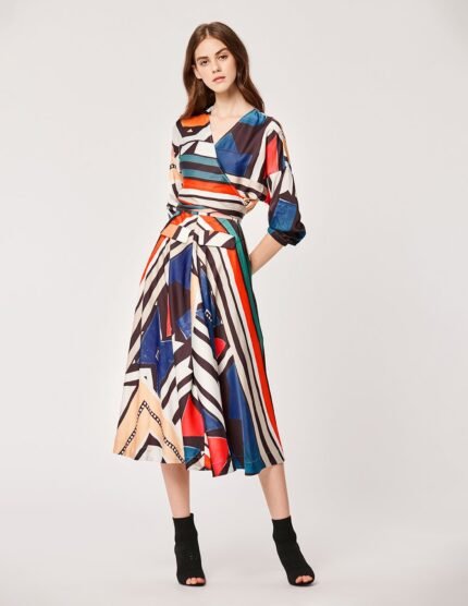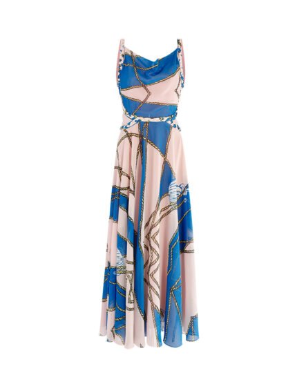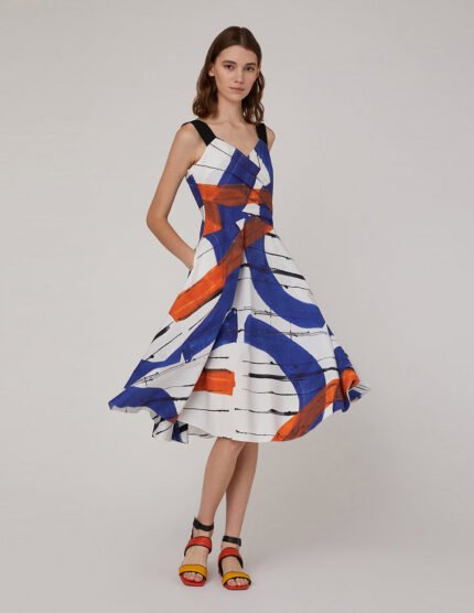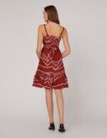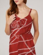 This red and white rope print woven belt dress is made of electro-spun fabric. It features metal eyelets and overlapping waist details to highlight the waistline. It is matched with a ruffled A hem. showing an ethereal atmosphere and a more youthful feel.