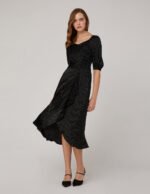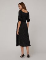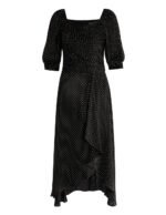 This black polka-dot dress features a V-neck and puffed sleeves in a minimal silhouette for a modern. retro vibe and a ruffled hem for an eye-catching finish. This style easily creates an elegant and romantic femininity.