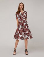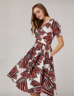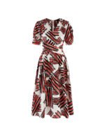 This dress is crafted from crisp and natural precision cotton. illuminated by an artistic abstract brushstroke print. with puffed sleeves and a crossover V-neck that adds a touch of Italian flair to your summer look.