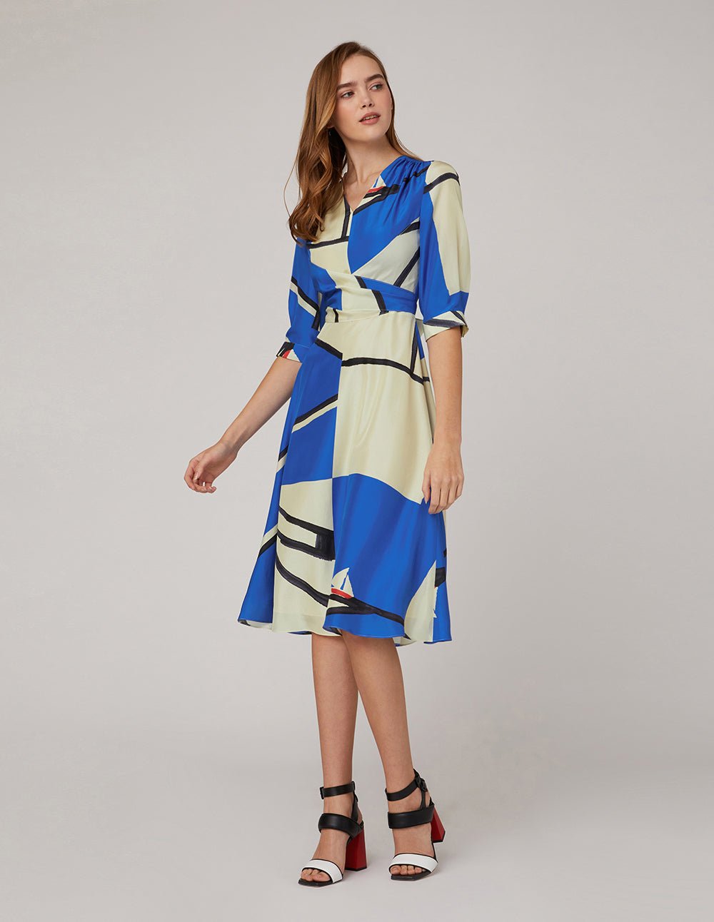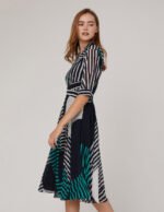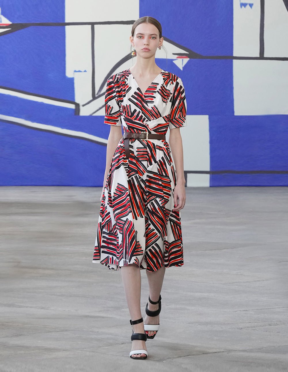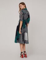 The nautical style stripe elements are used to show the classic and fashionable tonality through color contrast and graphic arrangement. The shirt collar with V-neck design is simple and generous. and the waist is divided into details with printing. and it is matched with the A-shaped profile. which can highlight the curvilinear beauty of the female body shape. The fit is suitable for many occasions.